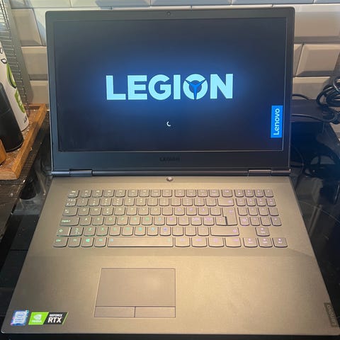 Lenovo Legion bærbar med 15" skærm og Intel Core i7-12700H, 16 GB RAM og 477 GB SSD, grå kabinet. Har numerisk tastatur og bagbelyst tastatur med farver samt stor touchpad.