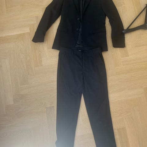 Sort jakkesæt til dreng fra WE i str 146. Blazer med knapper foran og bukser med elastik og snøre i livet. Har lidt struktur i stoffet. Lyseblå skjorte med lange ærmer og knapper hele vejen ned medfølger som på billederne.