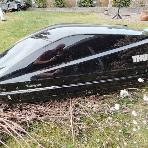 Thule Touring 100 tagboks i grå. Har lidt ridser på låget. Inklusiv Thule tagbøjler. Åbner fra siden.