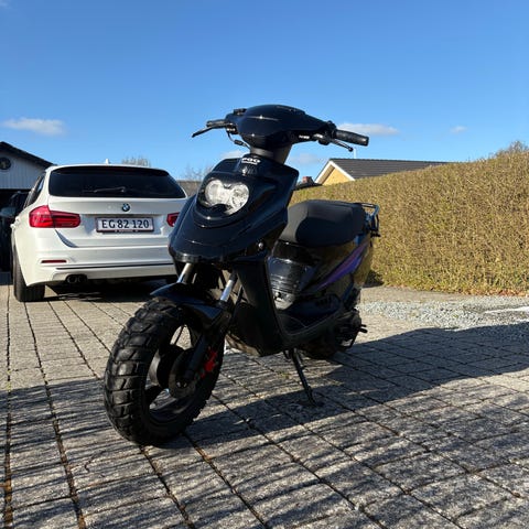 MotoCR Hot 50 scooter i sort med analogt speedometer og tydelige instrumenter. Har bredt sæde, store dæk og bagagebærer bagpå.