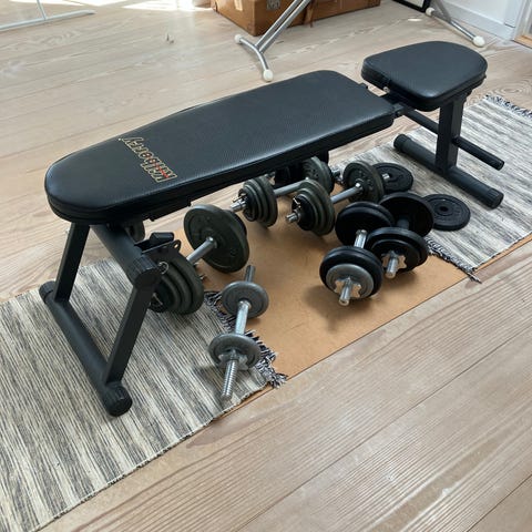 Træningsbænk med justerbar rygstøtte og sæde, egnet til vægttræning. Inkluderer flere vægtstænger og et sæt vægtskiver med forskellige vægtklasser, hvilket muliggør varieret styrketræning.