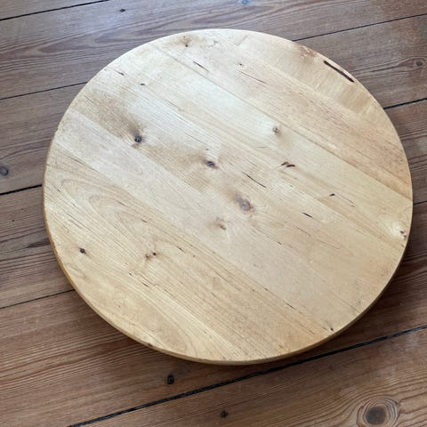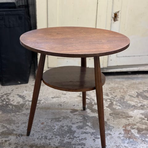 Rundt sofabord eller sidebord i egetræ. Trænger til en kærlig hånd, men kan sagtens laves og blive flot igen.