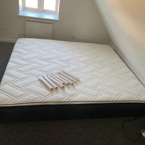Flot dobbeltseng i træ med både hoved- og fodgavl i enkelt design. Stabil ramme med let afrundede kanter og plads til to madrasser side om side.inkl madrasser og topmadrasserl l 210 b190