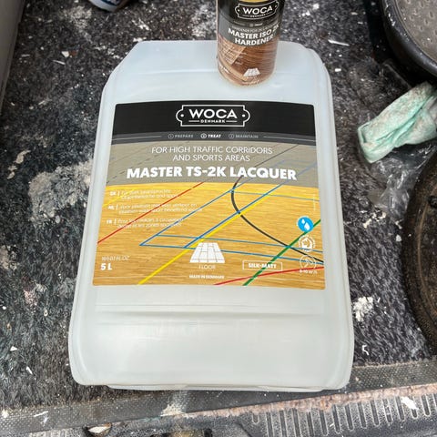 Trip Trap Woodcare gulvlak, mat udgave i spand med 2,5 liter. Vandbaseret lak til trægulve med tydelig brugsvejledning og info på siden af spanden.