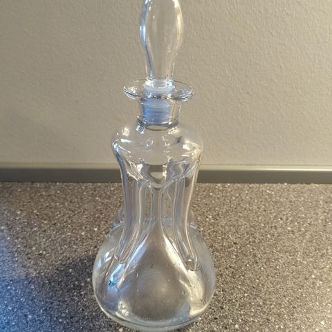 Mellem 75 og 100 år gammel glaskaraffel med glasprop, fra dansk glasværk. 26 cm høj, største diameter 8 cm.