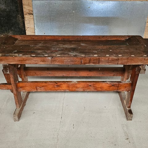 Super fin gammel høvlebænk, med al den patina som sådan én skal have. Har tidligere stået på en teknisk skole i mange år. Kan nemt skilles ad og derfor nem at transportere.