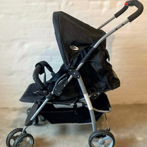 Bassin klapvogn i sort med sele og varekurv.