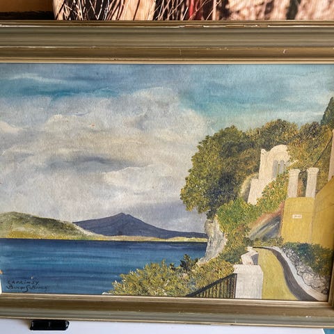 Flot landskabsmaleri med solnedgang og dale i varme farver. Sidder i en mørk træramme med tydelig åretegning, klar til at hænge op. Original