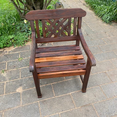 Flot havebænk i hårdt træ som lige har fået rå linolie og teaktræsolie