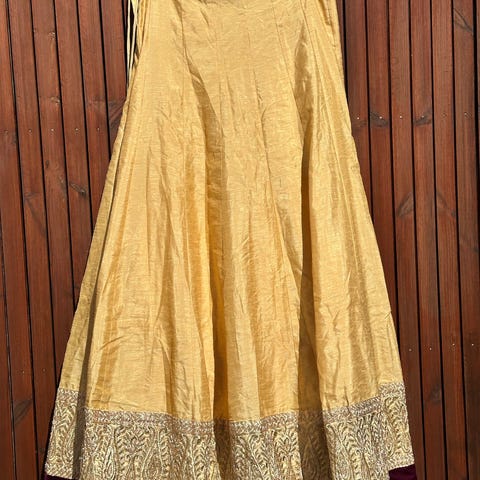 Fin håndsyet lang boho nederdel. Magentarød m/ gulddetaljer. Lynlås i siden.