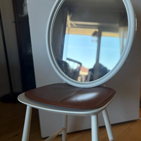 Flot og stilrent rundt spejl i hvid træramme. Den runde form er et populært valg i boligindretning, da den bløder rummets linjer op og tilfører et roligt, organisk udtryk.