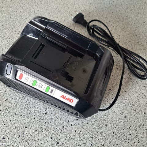 OPLADER: Black & Decker 36V Li-Ion batterier med tilhørende lader sælges samlet. Batterierne har indikator for strømniveau, og laderen har lysdisplay i siden.