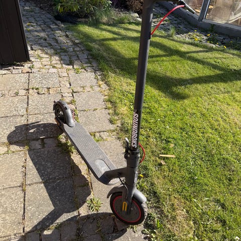 Xiaomi el-løbehjul i sort med røde detaljer. Har store hjul, håndbremse på styret og bred fodplade.