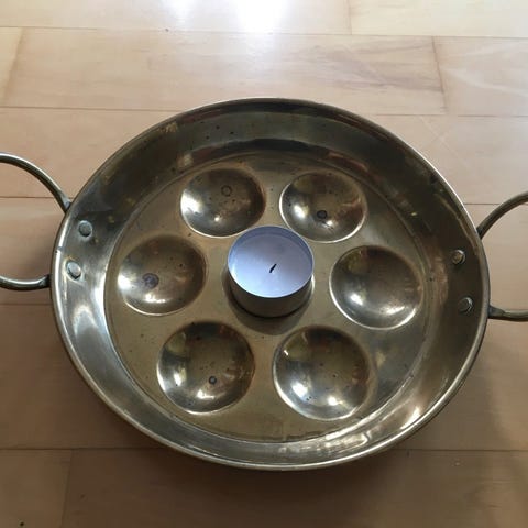 Messing, 2 små æbleskivepander i messing, Der er her tale om to små vintage æbleskivepander / fade i messing. Har en del patina så er nok mest til pynt i indretningen.