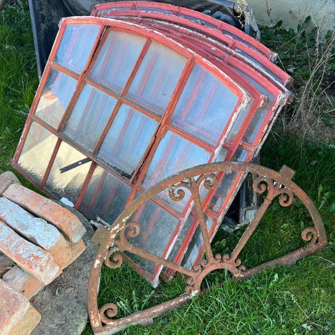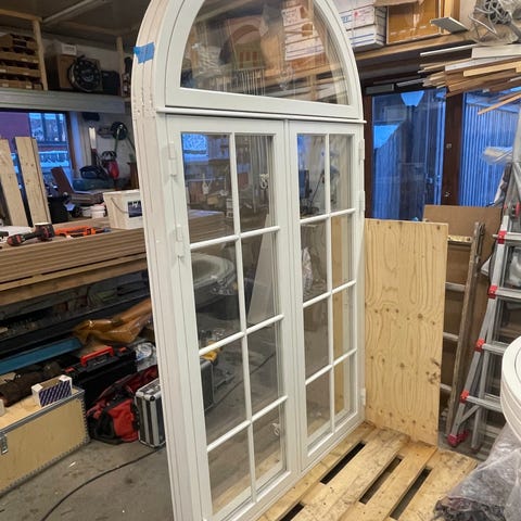 Fine buede vinduer med sprosser i hvidmalet træ og klart glas. God som dekorationsvindue eller til et projekt, hvor du mangler et særligt vindue med opdelt glas.