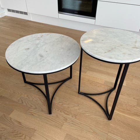 2 flotte borde i forskellig størrelse. Det store bord har en højde på 60 cm og en diameter på 42 cm