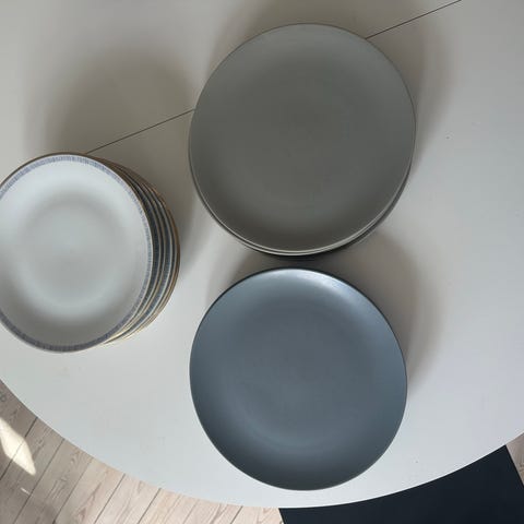 Grå og blålige tallerkner fra IKEA, ca. 27 cm i diameter. Enkel, rund model i stentøjslignende look, fin til spisebordet.