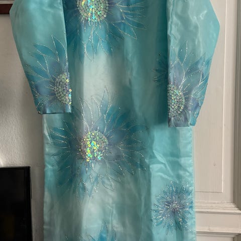 3 dele, skjorte, sjal og bukser. Skjorten er broderet foran og bagpå. Skjortens halsudskæring er dekoreret med perler. Sjalen er dekoreret med smuk blonde og hængende perler, skjorten har en slids foran, kun til engangsbrug.