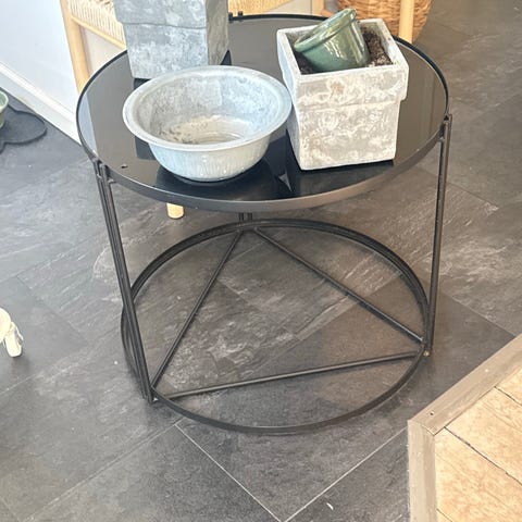 Sofabord fra Kaare Design, med rund glasplade og sort metalstel med geometrisk mønster. Står stabilt på gulvet og er let at flytte rundt.