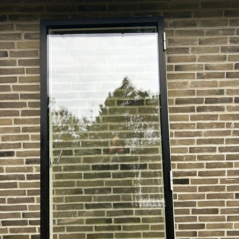 Stort fast vindue med sort aluminiumsramme/og sort træ indvendig.