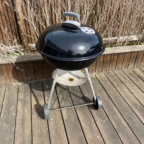 Weber kuglegrill i sort med låg og håndtag foroven. Har rist, askebeholder under og hjul så den er nem at flytte rundt i haven.