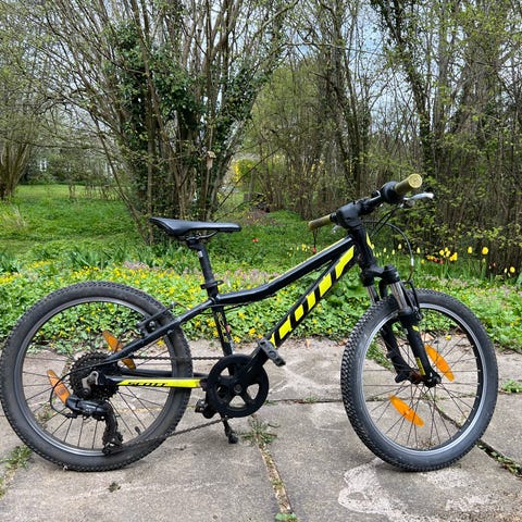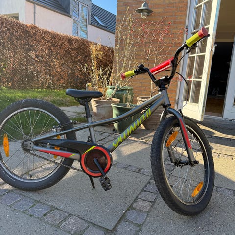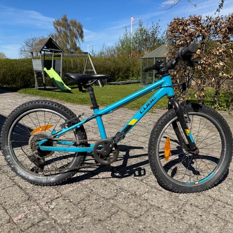 børnecykel med 20" hjul, brede dæk og 8 gear. Har skivebremser, skærme og orange detaljer på styr og stel. Cyklen fremstår super flot.