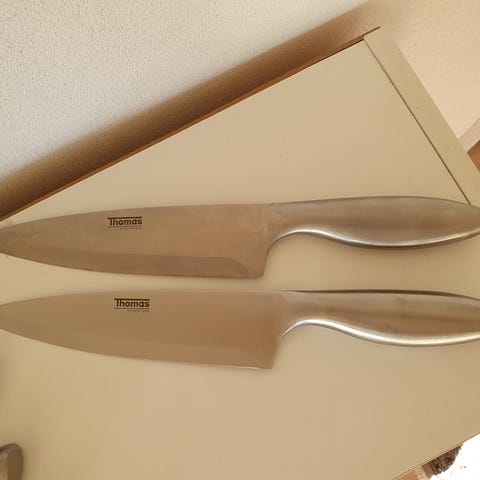 Sæt med Lion Sabatier køkkenknive i rustfrit stål, fuldt metalgreb på alle knive. Indeholder flere forskellige knivtyper, bl.a. brødkniv med bølget klinge og større kokkeknive. Trænger til at blive sleben. Sælges samlet