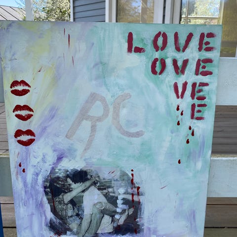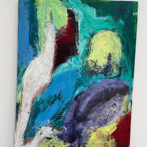 Abstrakt maleri på lærred i grå og lilla nuancer