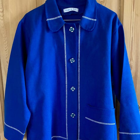Smuk jakke syet af to broderede duge i grøn og hvid i eget design, Design by Jane, str M-XL med lomme og knapper sælges kr 950,-