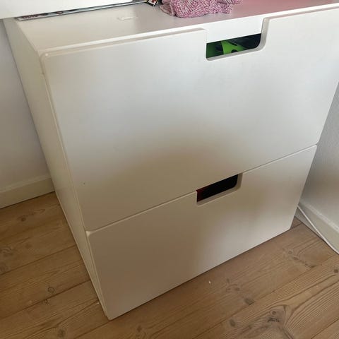 Den ene kommode har en mindre vandskade på toppladen, men fungerer ellers fint.