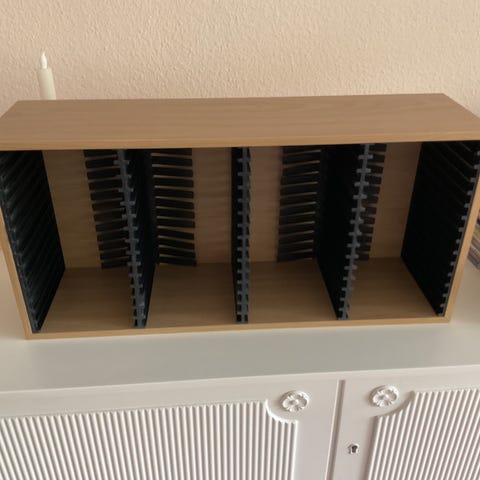 23 HAMA CD-reoler b 23 cm, plads til 52 enkelt CD’er og 4 dobbelt CD-er. 25 kr pr stk, 500 kr for dem alle.