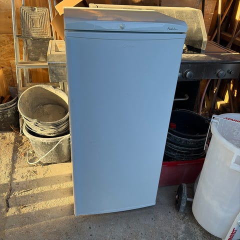 Scandomestic skabsfryser i hvid med frontlåge og blå inderskuffer. Mål ca. 85 x 54 cm, enkel model der er lige til at sætte til strøm.