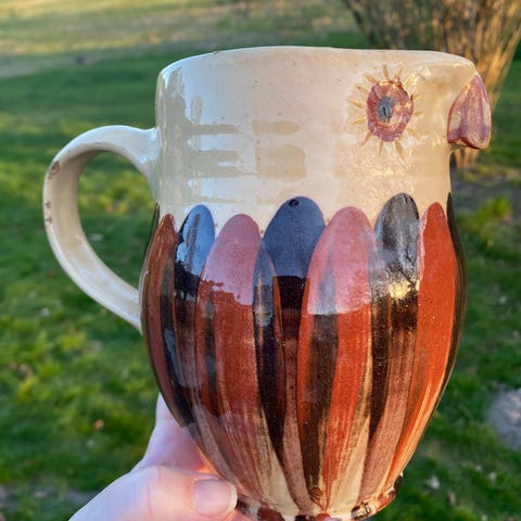 Fin keramik kande med sejlbådsmotiv og hank fra Humlebæk Kreamik. Har hældetud og dekoration hele vejen rundt med mørke mønstre på lys glasur.