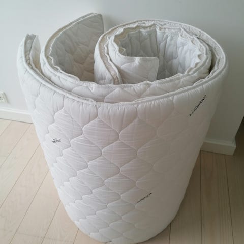 Hvid Livingbed topmadras med bølgemønster i stoffet. Lækker kvalitet ved ikke om det er memory eller latex