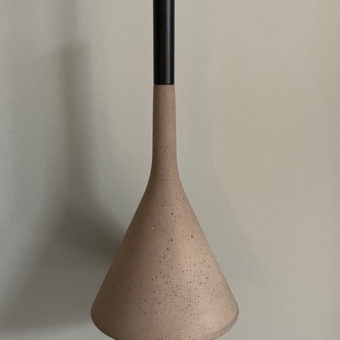 Sæt med tre pendel loftlamper i sort, hvid og grå med trætop og stofledning. Smalle kegleformede skærme, der hænger i hver sin farvede ledning.