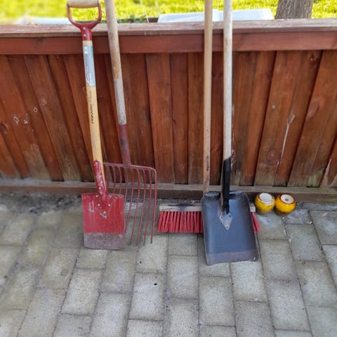 Samlet sæt have- og rengøringsudstyr med skovle, river, kost, håndsav, sprøjte og græstrimmer. Der følger også en ledningsfri støvsuger og lidt ekstra småting til haven med i bunken.