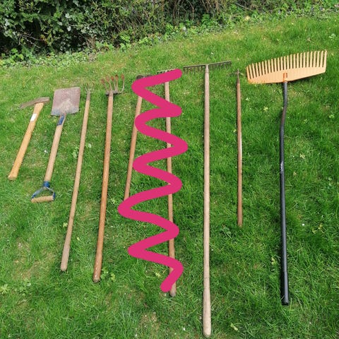 Sælges helst samlet. Sav, nedstryger, stor grensaks, lille saks, 2 planteskovle , 2 kultivatorer
