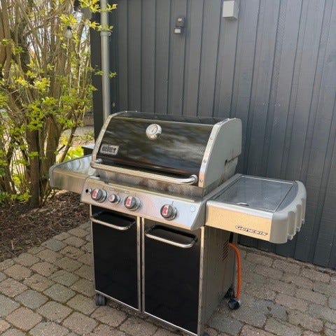 Nexgrill Evolution Infrared Plus gasgrill med flere brændere og stort grillareal. Har låg med håndtag, sideborde, opbevaringsskab under grillen og gasregulator monteret.