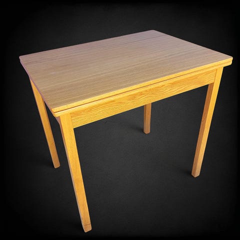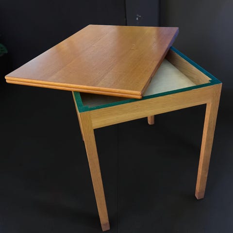Alsidigt multifunktionsbord i teakfinér og massivt egetræ, tilskrevet Ejner Larsen og produceret hos Næstved Møbelfabrik. Foldbar og drejelig plade med skjult opbevaring gør det ideelt til mindre boliger. Særligt for dette bord er den originale mærkat fra Statsfængslet ved Nørre Snede, som er bevaret og medfølger. Fremstår renset og i flot stand.