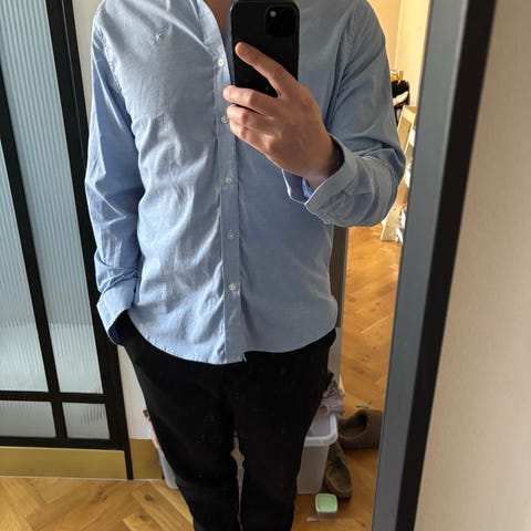 Hvid slim fit skjorte fra H&M i str M, i bomuld med knapper hele vejen ned. Klassisk model med krave og manchetter, god som pæn skjorte til bukser eller jakkesæt. Grå bukser og mørkeblå blazer som foto. Pæn stand, brugt én gang. Sælges samlet. Afhentning Værløse.