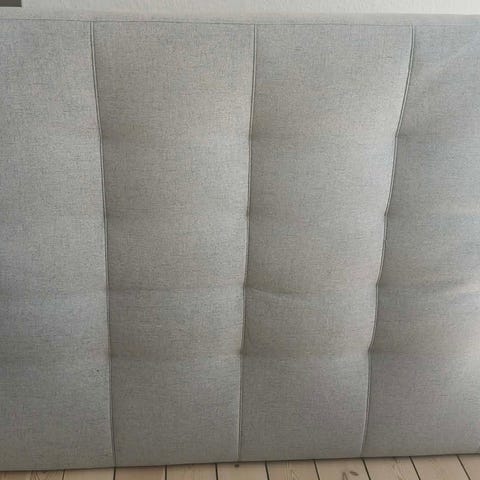 Grå sengegavl fra Ilva, polstret med stof hele vejen rundt. Måler 120 i højde og 180 Længde. 7 cm i dybden som vist på billedet. Købt for 1500 sælges til 300 kr.