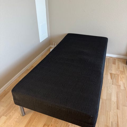 Seng fra Jysk med mørkegråt betræk. Står på træben og er nem at placere i rummet.