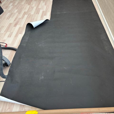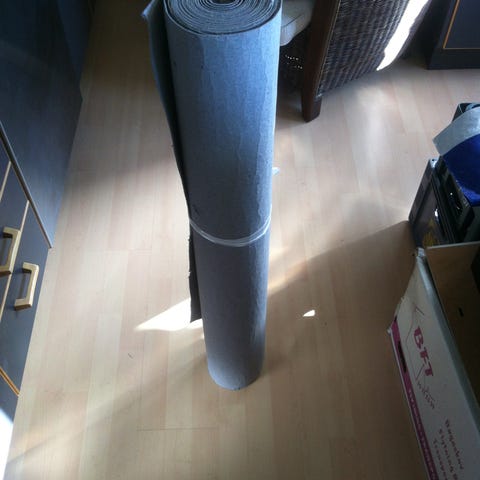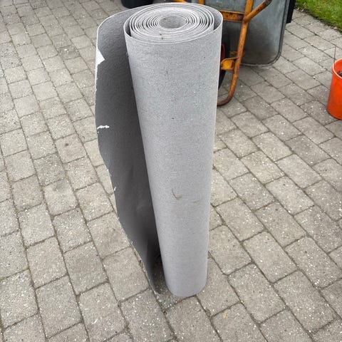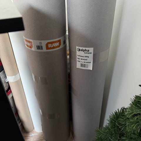 3 ruller gulvpap, 2 der er brugt, som ikke er så lange, og så 1 stor rulle helt ny