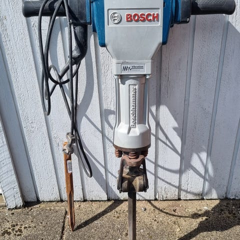 Bosch GSH 16-28 nedbrydningshammer med kraftigt håndtag og lang ledning. Ligger i robust plastkuffert og har standard SDS-hex værktøjsfæste for mejsler. 1. Ejer, har været brugt til vores kælderprojekt.