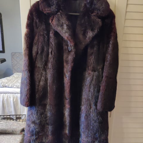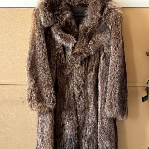 Vintage kunst. Lavet i England. Lang slank model formentlig str Small. Der følger bælte med, men det kan ikke sidde fast i venstre side.