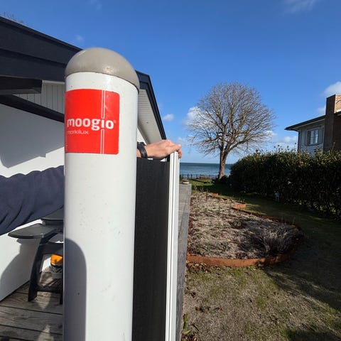 Creme farvet side markise med kassette og stolpe, der trækkes ud til siden. Nem at montere ved terrasse eller altan og giver god afskærmning for indkig og vind. Fra Moreland.