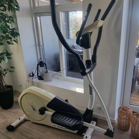 Abilica Sport crosstrainer i sort med store fodplader og bevægelige armarme. Har lille display foran og justerbar modstandsknap ved siden af svinghjulet.