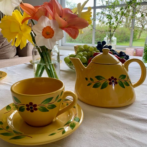 Fransk porcelæns lot bestående af 4 kaffeskåle, 2 kander, 2 skåle, 1 fad og 1 terrin sælges samlet.
