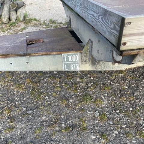 Enkel en-akslet trailer med stålkasse . Har bagklap der kan åbnes og reflekser/lygter bagpå. Uden nummerplade. Det ene dæk er punkteret.