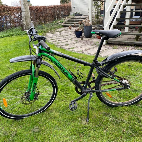Kildemoes børnecykel med 26" hjul i sort. Har støtteben, bagagebærer, skærme og reflekser foran og bagpå. Har lidt skræmmer hist og pist men stadig en meget god cykel.